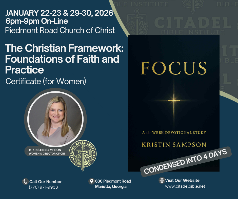 Welcome to Citadel Bible Institute’s Main Campus located at the Piedmont Road Church of Christ, in Marietta, GA. The elders and congregation at Piedmont Road are a friendly and welcoming congregation for all our students.